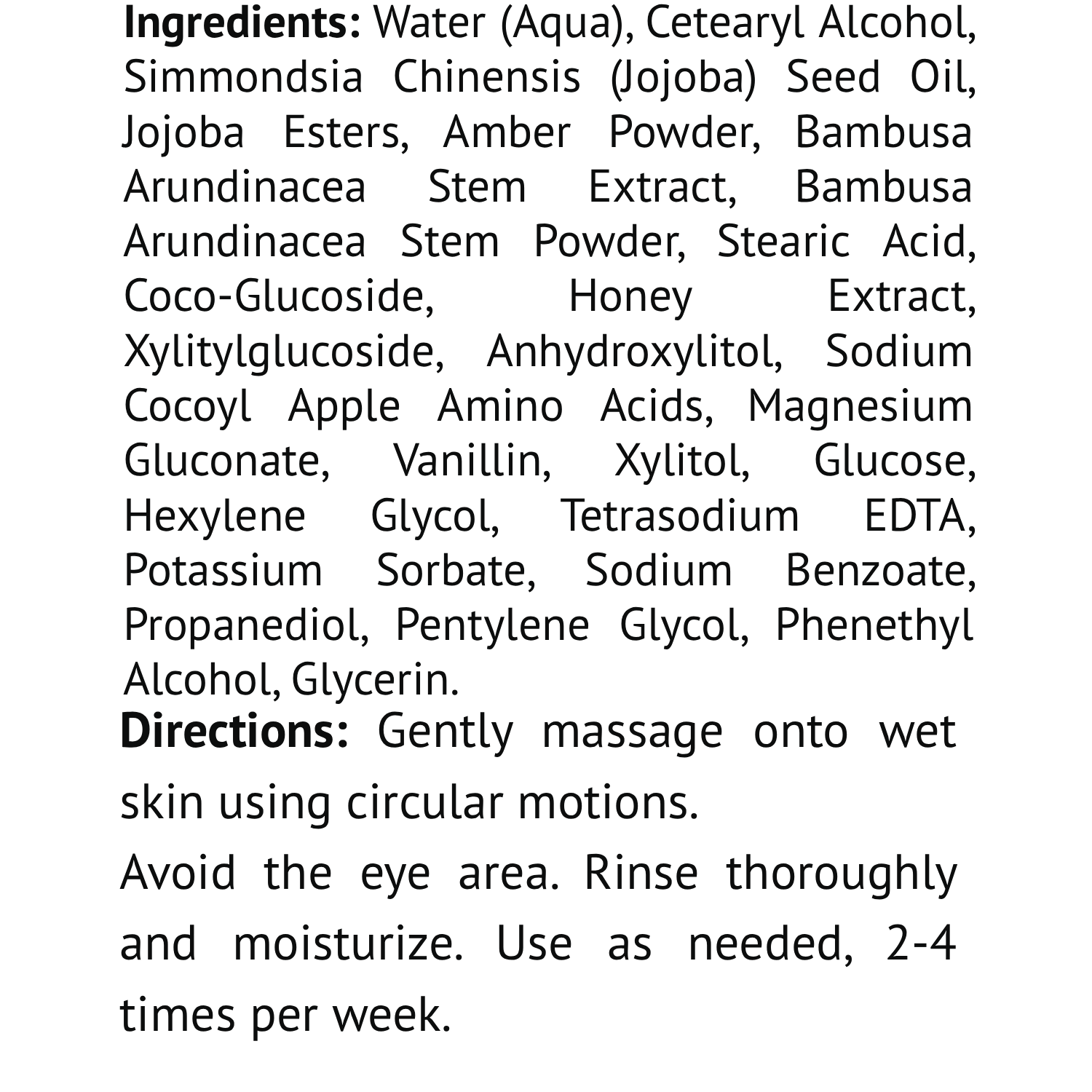Water, Cetearyl Alcohol, Simmondsia Chinensis (Jojoba) Seed Oil, Jojoba Esters, Amber Powder, Bambusa Arundinacea Stem Extract, Bambusa Arundinacea Stem Powder, Stearic Acid, Coco-Glucoside, Honey Extract, Xylitylglucoside, Anhydroxylitol, Sodium Cocoyl Apple Amino Acids, Magnesium Gluconate, Vanillin, Xylitol, Propanediol, Pentylene Glycol, Phenethyl Alcohol.